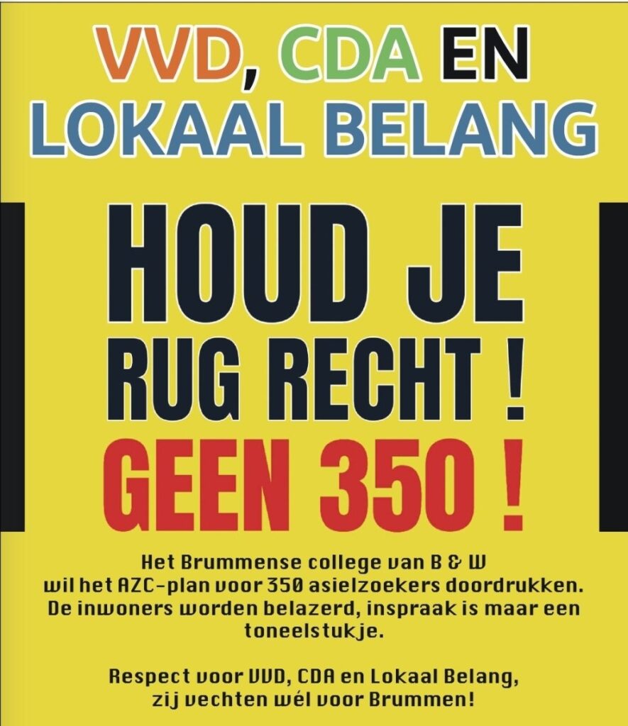 Het is aan de in de gemeenteraad vertegenwoordigde politieke partijen de overweging dat zij het mandaat die zij van de Brummense bevolking heeft gekregen om de belangen van de inwoners te behartigen en daarbij ook oog te hebben voor komende generaties. Opvang van een passend aantal vluchtelingen, evenredig verspreid over de gemeente, is vanzelfsprekend.