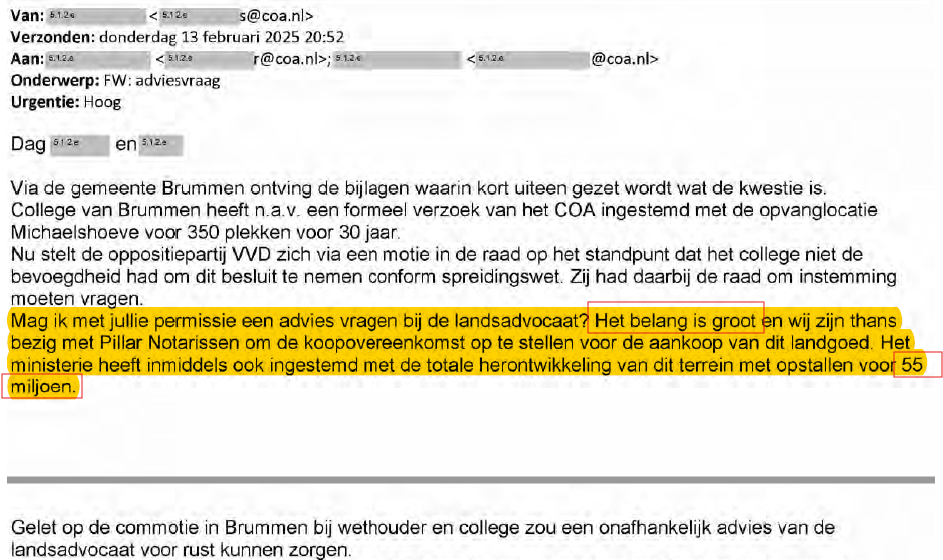 In februari van dit jaar vroeg de Brummense VVD-fractie aan de wethouder of zij wel alles volgens de regeltjes van wet heeft besloten. Er was toen paniek in het gemeentehuis en bij het COA. Daarom vroeg een medewerker van het COA om toestemming voor advies aan de landsadvocaat. Dit met het nadrukkelijke dringende verzoek omdat de minister 55 miljoen euro had toegezegd voor de totale her ontwikkeling van het Michaelshoeve-terrein … 55 miljoen euro! En nu na de brand wellicht méér dan 55 miljoen.