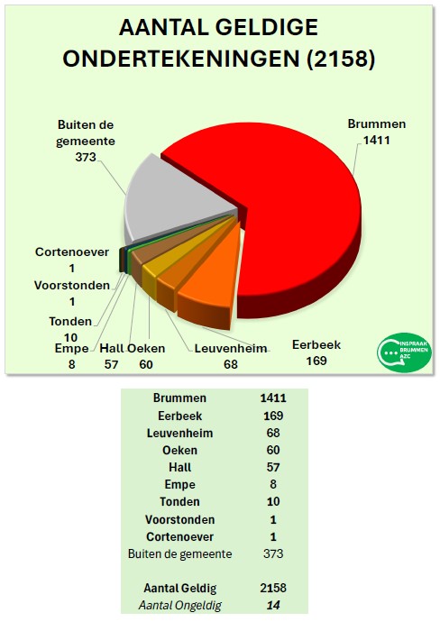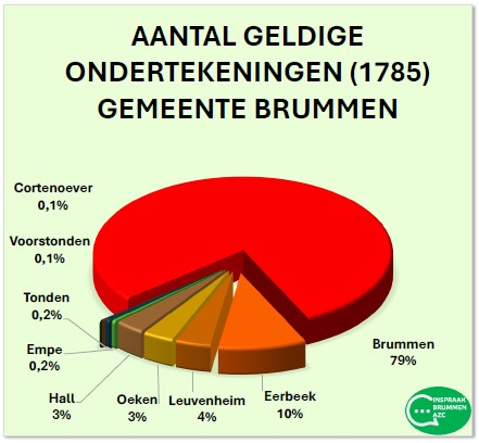 De petitie is ondertekend door 2172 (14-10-2025) personen uit de gemeente Brummen en daar buiten. 2158 zijn hiervan geldig. 1785 personen gaven aan dat zijn in de Gemeente Brummen wonen.